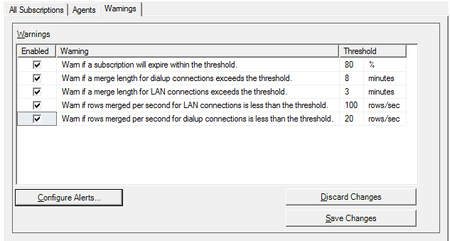 Are you actually able to get the Long Merge alert to fire? I've enabled the alert and have set a threshold but even when the duration of synchronization exceeds the threshold, it will not fire. I've created a Microsoft Connect item on this. I'm running 2008 R2 Enterprise.