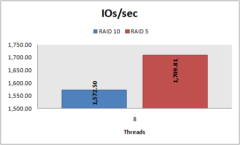 The scaling of the charts in this article leads to incredibly misleading bars. For example, the first graph, IOs/sec read, shows a RAID 5 column more than twice as high as the RAID 10, yet the difference between the two is less than 9%. In contrast, the same chart for IOs/sec write (4th) shows a RAID 10 bar that is only slightly higher than RAID 5, yet the RAID 10 number is 59% higher! The use of different scales on each of the charts leads to meaningless visual information.